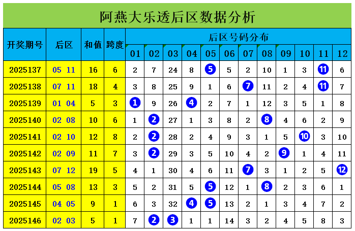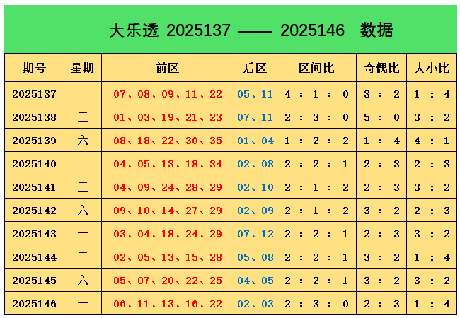上期回顾:大乐透第2025146期奖号为:前区06、11、13、16、22,后区02、03,前区奖号三区比为2:3:0,奇偶比为2:3,大小比为1:4,后区开出小小组合02、03