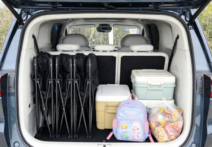 就算第三排座椅正常立着,照样能塞下四把露营椅、两个保温箱、孩子们的书包,还有一大袋子零食。车上那些挂钩和锚点也挺实用,汤汤水水的东西固定好,一路都不带晃的。