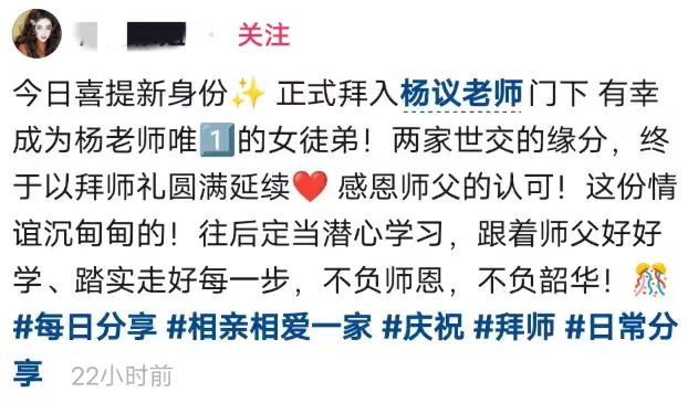 尽管杨议的女徒弟称两家是世交,但拜师视频中的举动,还是让一些网友质疑“传承变炒作”。